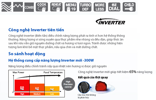 Hâm nóng tự động bằng cảm biến hồng ngoại Rã đông tự dộng bằng công nghệ Inverter Thực đơn cảm biến: 07 thực đơn Thực đơn tự động: 08 thực đơn Biến tần tan làm mềm:04 thực đơn Công thức nấu: Có Thêm/ Bớt: Có Khóa trẻ em: Có |