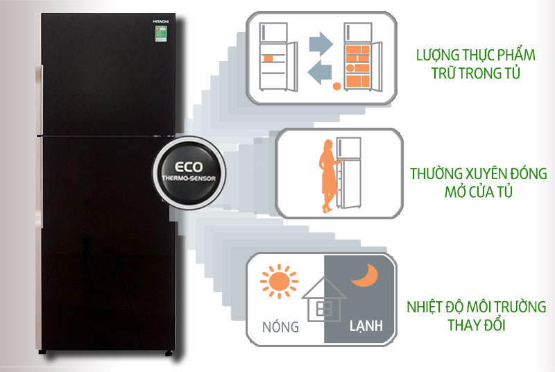 Tủ lạnh Hitachi R-VG470PGV3 có cảm biến nhiệt Eco độc đáo, ghi nhận sự thay đổi nhiệt độ của tủ lạnh và xung quanh rồi đưa ra tùy chỉnh chế độ phù hợp.